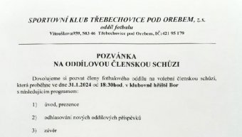 Oddílový výbor zve členy oddílu na odílovou schůzi, která proběhne 31.1.2024 v 18:30 v klubovně na hřišti v Boře. Hlavním bodem programu je projednání nových oddílových příspěvků.